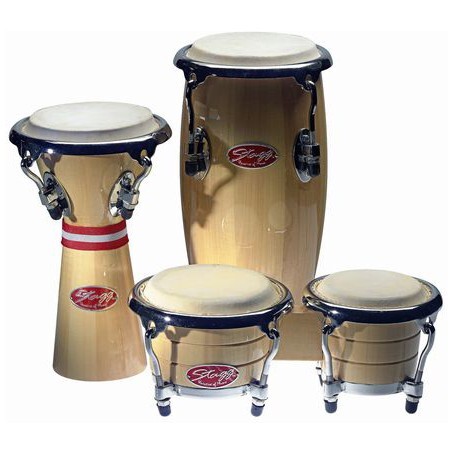 Sada malých dřevěných perkusí. Obsahuje 1x mini djembé 3 3/4" + 1 mini congo 4" + 1 mini bonga 3 1/8" a 3 3/4". Lakované dřevěné korpusy, ergonomický hardware a přírodní blány. Dodáváno v pouzdře. Víc než jen hračka!